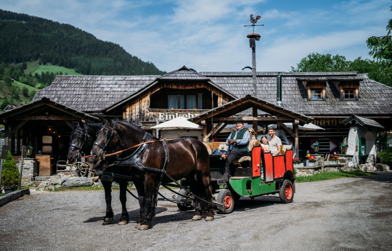 Nach einem sportlichen Skitag im Winter oder einer abenteuerlichen Wanderung im Sommer entführen wir Sie zu einer kuscheligen Pferdekutschenfahrt.