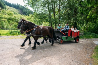 Nach einem sportlichen Skitag im Winter oder einer abenteuerlichen Wanderung im Sommer entführen wir Sie zu einer kuscheligen Pferdekutschenfahrt.